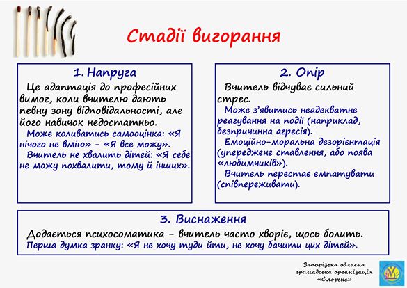 Вигорання – це реакція людини на хронічну втому. Вона починає негативно ставитись до роботи та предмету своєї професійної діяльності, у неї знижується самооцінка.Це захисний механізм організму, який часто не усвідомлюється.